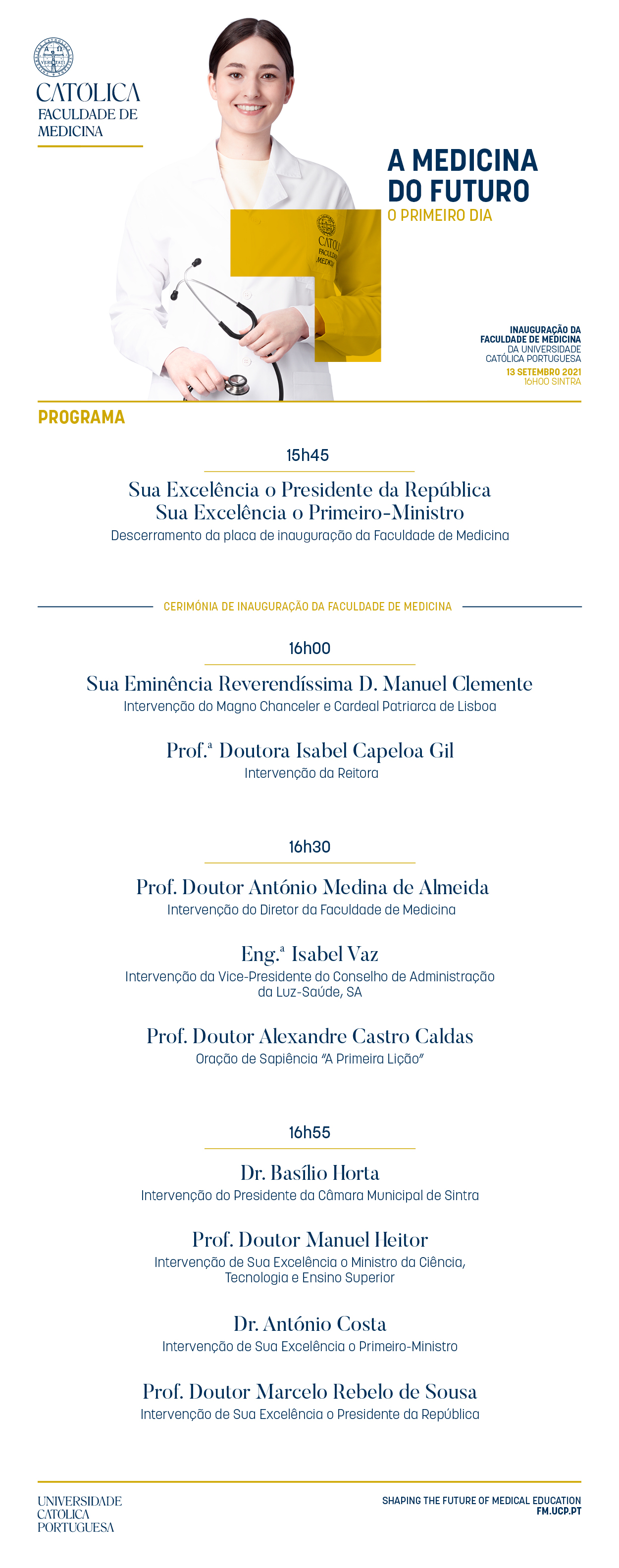 On September 14th, 2021, at 2:00p.m., the Católica Medical School of the Universidade Católica Portuguesa will be inaugurated by His Excellency the President of the Republic, Marcelo Rebelo de Sousa and His Excellency the Prime Minister, António Costa.